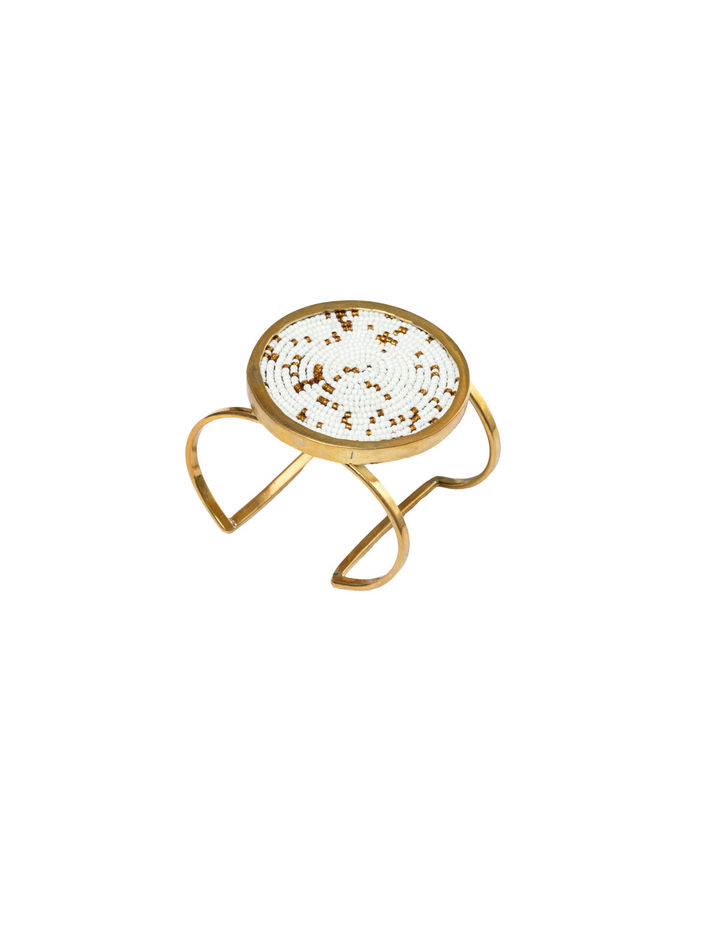 Elevate your style with this exquisite beaded brass cuff bracelet featuring intricate white and gold beadwork in a mesmerizing circular pattern. This statement piece showcases the meticulous craftsmanship of Kenyan artisans.